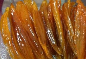 Món mứt xoài dẻo nhìn trong veo, ánh màu đường cánh gián, ăn dai dai,...